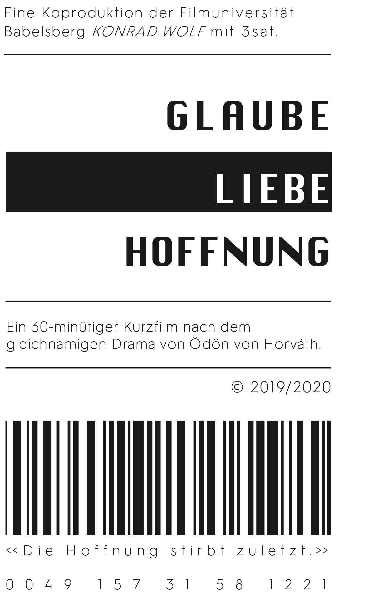 Für den Abschlussfilm >Glaube Liebe Hoffnung< des Regiestudenten Maximilian Conway suchen wir eine Maskenbildnerin/Maskenbildner. Der Film ist eine 30-minütige Tragikomödie nach Motiven des gleichnamigen Dramas von Ödön von Horváth, wird von 3sat koproduziert und hat seine Fernsehausstrahlung im November 2020.